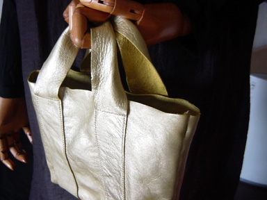 シャイニーなゴールドの牛革でミニトートをつくりました。あまりギラギラしていないのでちょっとした