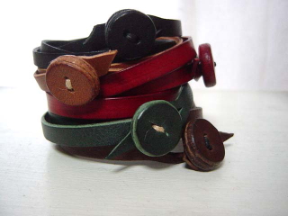 ぐるぐる巻きつけ、共革で作った小さな革ボタンをとおして