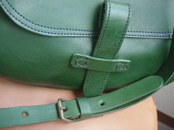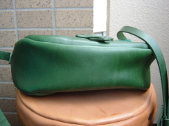グリーンのヌメ革で作ったショルダーバックです。 肩掛けでも使えます。 フタの裏はピッグスエードをはってます。 シミ、キズになりやすいですがそこ も味になります。 裏地はリネン。ポケットはフランスのアンテークファブリックです 小ぶりですがマチがたっぷりありますので ちょっとしたおでかけに便利です