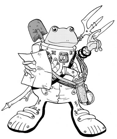 イラストの山師が着ているのは防乾服。両生類である彼らにとって、身体が乾くことは死を意味する。ゴンドワナの宿屋にはカエル人用の水を満たした部屋などが常備してあるところも多い。