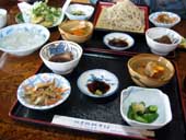 もりそばには、刺身こんにゃく、棒タラ煮、きのこの天ぷら、青菜の和え物など、