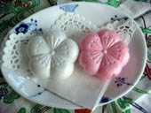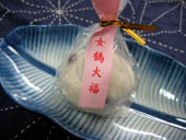 酒田の女鶴大福という1個180円の大福です。特殊なお米で出来ているそうです。 |