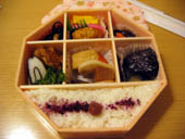 ホテルにデパ地下のお弁当を買って、チェックイン。銀座大増のお花見弁当です。 |