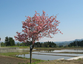 19、越後平野の水田と、八重桜 遠くに越後三山が見えました。田植え前の水田にうつる光景なかなかの味です。 |