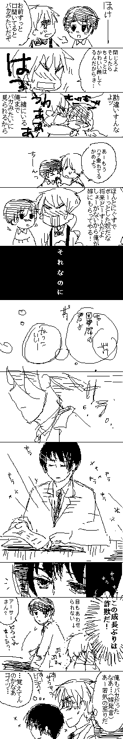 パラレルえいにち続き 今になってもんもんもんもんとするアーサー君(18) 仔菊が何言われても何も反応せずにぺとぺとついてきてたのは 単に言葉がわからなかっただけかもしれませんね。 よーやっと覚えたのは「アーサーくん、あーそーびーまーしょー」だけだという… 一見幼馴染っぽいですが、仔菊が貧しい国から養子に引き取られた兄弟設定でもいけそうです(じゅるり)