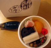 船橋屋のあんみつです。疲れていたので1つ買って、ホテルの部屋で食べました。 |