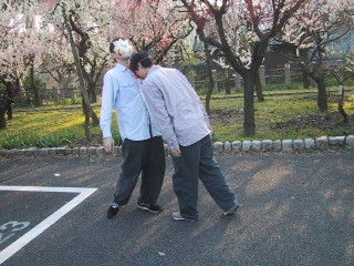 相手が苦痛の余りに前かがみになったとき、首筋に肘を打ち下ろします。