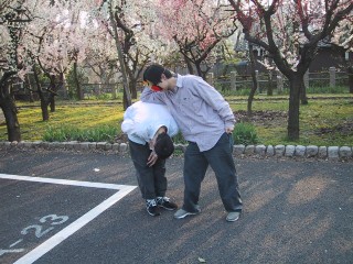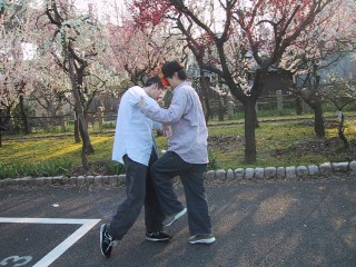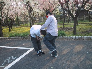 素早く頭を下げ、前かがみになって相手の腕をかわします。