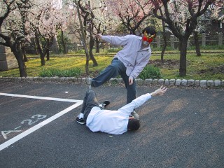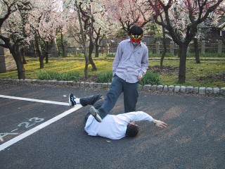 倒れこんだ相手の後ろに立ち、脇腹部分に自分の利き足を高く振り上げます。