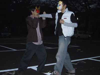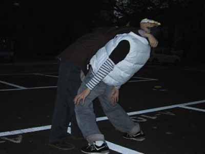 半身の姿勢になり、両腕で相手のチョップを止めます。